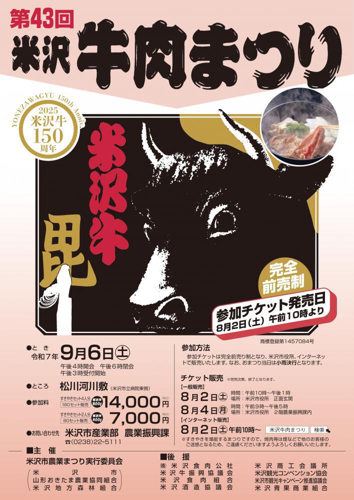 毎年恒例の「米沢牛肉まつり」が9月6日(土)に開催されます!「米沢牛肉まつり」とは、松川河川敷で約900人が最高級の米沢牛を食べる一大イベントです。河川敷にずらっと並んだテントの中で、夕方から夜にかけて各々七輪を囲み、細やかな脂のさしが丁寧に入った、とろけるような味わいの牛肉に舌つづみを打ちます。 1980年から始まった「米沢牛肉まつり」は、「米沢の味ABC」の代表格である米沢牛を参加者の皆様で楽しく食して、牛肉の消費拡大と「米沢牛」の銘柄高揚を願い、開催されています。この機会に最高級の米沢牛をご堪能ください!なお、参加チケットは完全前売り制ですので、下記の参加チケット購入方法をご確認ください。◇開催日 2025年9月6日(土) 受付15:00 開会16:00 閉会18:00◇場 所 松川河川敷(米沢市立病院東側)◇参加料 すき焼きセット4人分 14,000円(税込)     すき焼きセット2人分   7,000円(税込)     ◇すき焼きセット内容米沢市内の畜産農家が生産した最高級の米沢牛(4人分セット800g、2人分セット400g)白菜、ネギ、糸こんにゃく、豆腐、春菊、えのき、舞茸、卵、すき焼きタレ、箸、お椀なお、野菜の生育状況によっては、内容が一部変更となる場合がございます。◇チケット販売販売日時:令和7年8月2日(土曜日)午前10時から午後1時販売場所:米沢市役所1階市民ホールオンライン購入:インターネット販売は同日10時からインターネット販売はこちらから御購入にあたっての注意点 市役所販売、インターネット共に先着順になります。 牛肉まつり当日は、チケットとセット一式が引き換えになりますので必ずご持参ください。 購入後の返金はいたしかねます。【お問い合わせ及び申し込み先】  米沢牛肉まつり部会 事務局(米沢市農業振興課)  住所:〒992-8501 米沢市金池5丁目2番25号  電話:22-5111(内線4301、4300)
