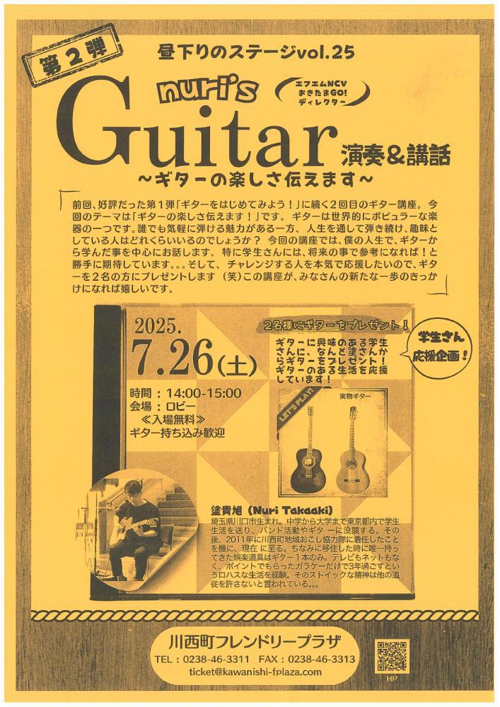 川西町フレンドリープラザにて、エフエムNCVディレクターの塗貴旭さんによるギター講座が開催されます。学生さん応援企画として、参加した学生2名にギターのプレゼントも!ぜひ、ご来場ください。<日時>令和7年7月26日(土) 開演:14:00<場所>川西町フレンドリープラザ<入場料>無料<問い合わせ>川西町フレンドリープラザ 0238-46-3311詳細は、チラシをご覧ください。