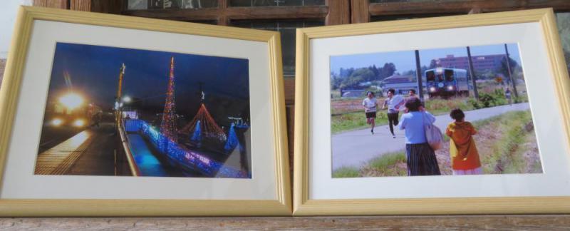「旅と鉄道」のライターさんが、「駅や鉄道には人が映っているのがいい。」と話してくれましたが、今回は今までになく人物が登場している作品が多いようです。順次紹介していきますが、映り込みもあって作品の素晴らしさを十分にお伝え出来ません。ぜひ、会場にて本物をご覧になってみてください。 最初は遠藤博さんの「帰宅時間」(左)と「負けるな!」(右)。「帰宅時間」は、四季の郷駅に降りて、家路へと向かう人が映っています。四季の郷駅のイルミネーションを見たことのある方には、幻想的なイルミネーションのトンネルが甦るのではないでしょうか。 「負けるな!」は、羽前成田駅から白兎駅の区間で、フラワー号と競走大会をした際の写真。必死になって走っている人とそれを応援する人。そんな沿道の人たちを見て走るフラワー号が笑っているようです。