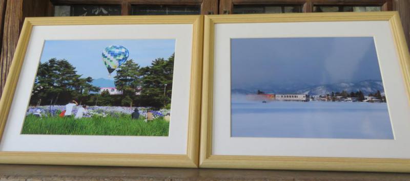 次に紹介するのは松永政和さんの作品です。左は「いっせいにパチリ」。アヤメ祭りで上げられた熱気球とサクラ号が配置されている。そのどっしりとした構図の手前でカメラを構えている人たちの姿に、思わずほっこりしてしまいます。松永さんらしいユニークな視点が楽しめる作品です。  右は「雪煙を上げて」。米屋こうじさんはこの作品に対して、「雪原と冬空のコントラストが面白い。」と感想を語っていました。先の作品とは異なり登場人物(?)は松永さんだけ。松永さんはただ一人で雪原に立って、シャッターチャンスを待っていたのでしょうか。作品を創ることは大変なことなのだと、改めて教えられる作品である。