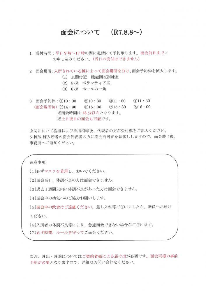 令和7年8月8日(金)より、面会枠の拡大を行います。これまで1か所で対応していた面会場所を3か所に増やすことで、受け入れするご家族様を拡大し、ご予約が取りやすくなります。今後もより多くのご家族様に安心して面会に来ていただけるよう環境整備に努めてまいります。