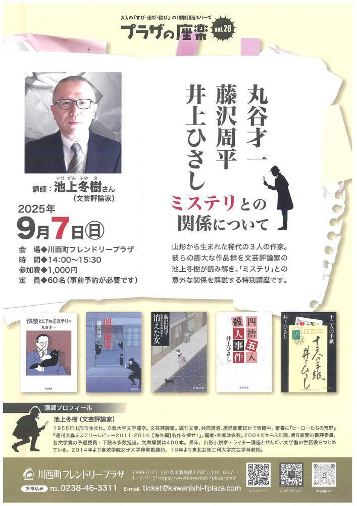 川西町フレンドリープラザにて、文芸評論家である池上冬樹さんを講師に、山形から生まれた稀代の3人の作家、丸谷才一・藤沢周平・井上ひさしとミステリの関係を読み解く特別講座を開催します。ぜひ、ご来場ください。<日時>令和7年9月7日(日) 14:00〜15:30<場所>川西町フレンドリープラザ<料金>1,000円<定員>60名(事前予約が必要です)<問い合わせ・予約先>川西町フレンドリープラザ Tel 0238-46-3311詳細は、チラシをご覧ください。