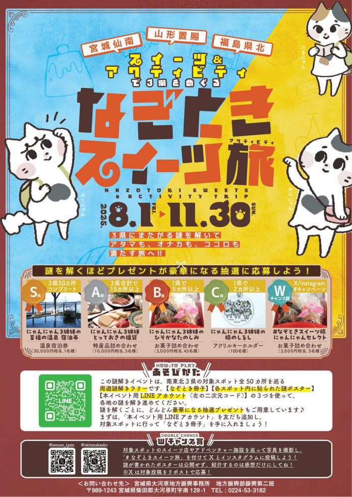 宮城・山形・福島の3県にまたがる謎を解いて、豪華賞品を当てよう♪なぞときスイーツ旅チラシ(PDF:7,349KB)【開催期間】2025年8月1日(金)〜11月30日(日)【開催場所】宮城県仙南地域、山形県置賜地域、福島県県北地域「25市町村」のスイーツ店25店舗とアドベンチャー施設25カ所の計50スポット 宮城県仙南地域:白石市、角田市、蔵王町、七ヶ宿町、大河原町、村田町、柴田町、川崎町、丸森町 山形県置賜地域:米沢市、長井市、南陽市、高畠町、川西町、小国町、白鷹町、飯豊町 福島県県北地域:福島市、二本松市、伊達市、本宮市、桑折町、国見町、川俣町、大玉村【参加方法】このイベントは、南東北3県の対象スポット全50カ所を巡るLINE参加型の謎解きラリーです。《なぞとき冊子》《各店舗に貼られた謎ポスター》《本イベント用LINEアカウント》の3つを使って、各地の謎を解き進めてください。謎を解くごとに、どんどん豪華になる抽選プレゼントもご用意しています!まずはチラシの「本イベント用LINEアカウント」を友だち追加し、対象スポットに行って「なぞとき冊子」を手に入れましょう!皆さんのご参加をお待ちしています!【お問い合わせ】宮城県大河原地方振興事務所 地方振興部振興第二班TEL:0224-53-3182