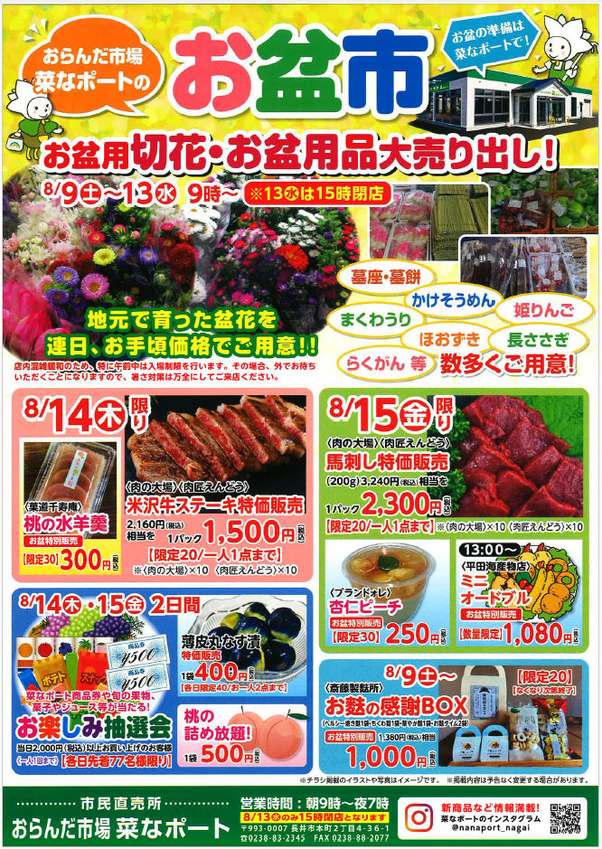 菜なポートのお盆市 開催!開催日:8月9日〜8月15日 9:00〜19:00 (13日は15:00まで)8月9日〜8月13日はお盆用切花・お盆用品大売り出し!!地元で育った盆花を連日、お手頃価格でご用意しております。他にも墓座・墓餅・かけそうめん・姫りんごなど数多くございます。9日〈斎藤製麩所〉お麩の感謝BOX【限定20個】14日〈肉の大場〉〈肉匠えんどう〉米沢牛ステーキ特別販売! 【限定各20セット/1人1点まで】(肉の大場×10 肉匠えんどう×10)〈菓道千寿庵〉桃の水羊羹【限定30個】 15日〈肉の大場〉〈肉匠えんどう〉馬刺し特価販売! 【限定各20セット/1人1点まで】(肉の大場×10 肉匠えんどう×10)〈ブランドォレ〉杏仁ピーチ【限定30個】13:00~ 〈平田海産物店〉ミニオードブルお盆特別販売【数量限定】 14日・15日 2日間お楽しみ抽選会 【先着77名限り】※当日2,000円(税込)以上お買い上げのお客様対象(1人1回まで)薄皮丸なすつけ 特価販売【限定40袋1人2点まで】桃の詰め放題! 詳しくはチラシをご覧ください。
