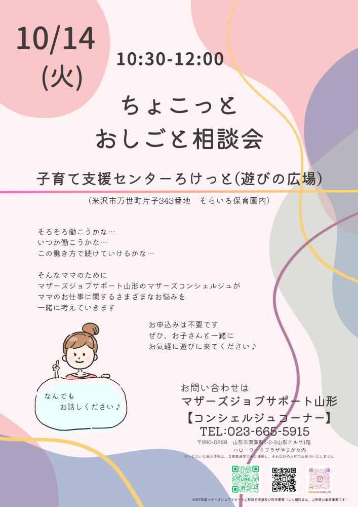 「おしごと相談会」10月開催のお知らせです*.:・.。**.:・.。**.:・.。**.:・.。**10月14日(火)@10:30〜12:00 『ちょこっとお仕事相談会!』そろそろ働こうかな...いつか働こうかな...この働き方で続けていけるかな...そんなママのためにマザーズジョブサポート山形のマザーズコンシェルジュがママのお仕事に関するさまざまなお悩みを一緒に考えていきます一緒に不安を解消したい方、ご興味のある方、ぜひ、ご参加ください(^^)/お申込みは不要ですぜひ、お子さまと一緒にお気軽に遊びに来てください(^^♪ 【場所】子育て支援センターろけっと 【遊びの広場】(米沢市万世町片子343番地 そらいろ保育園内)マザーズジョブサポート山形は就職活動に役立つセミナーを開催いたします。また、おしごとや育児との両立に関する個別のご相談も承ります。LINEをご登録頂くとさまざまなセミナー情報が見れますのでぜひ登録下さい♪LINE登録はこちらからお問い合わせは…マザーズジョブサポート山形コンシェルジュコーナーTEL:023-665-5915