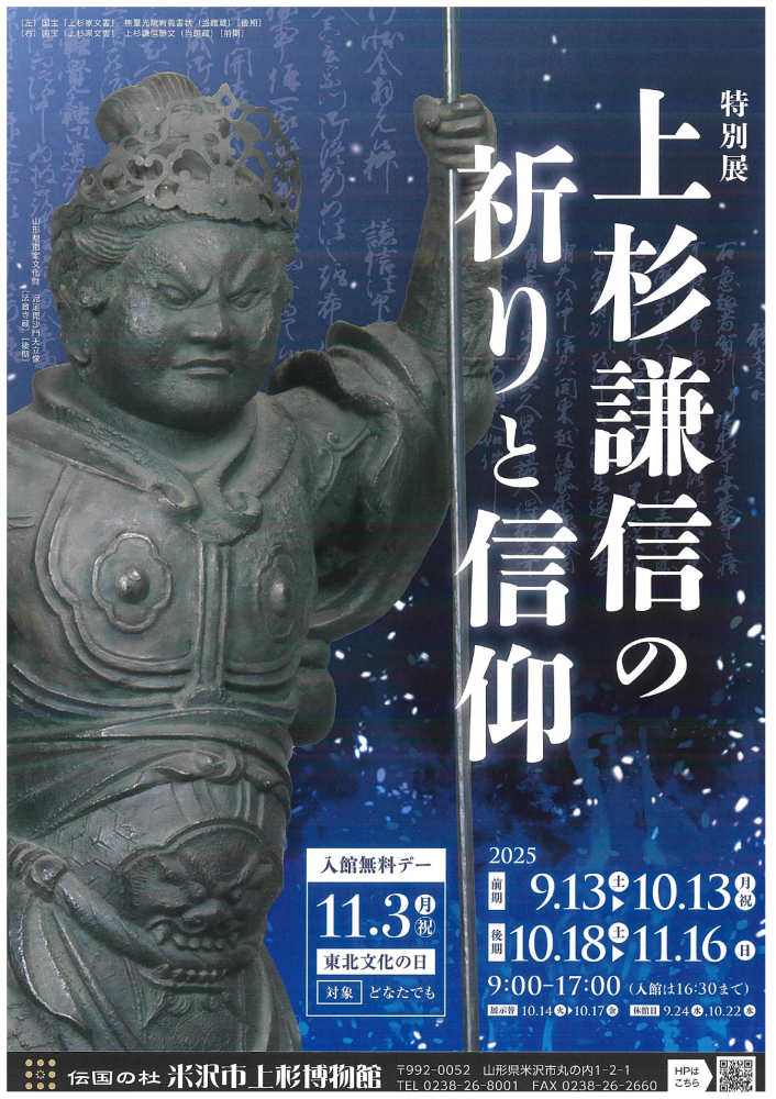 米沢市上杉博物館にて「特別展 上杉謙信の祈りと信仰」が開催されます。本展では、上杉謙信が信仰した軍神や宗教を主軸に置き、その後米沢上杉家に引き継がれていく信仰のかたちを、主に謙信にゆかりのある多様な文化財から紹介します。ぜひ、ご来場ください。<日時>日前期:令和7年9月13日(土)〜10月13日(月・祝)後期:令和7年10月18日(土)〜11月16日(日)時間9:00〜17:00(入館は16:30まで)<場所>米沢市上杉博物館<料金>一般 800円高大生 500円小中生 300円<問い合わせ>米沢市上杉博物館 0238-26-8001詳細は、チラシをご覧ください。