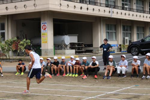 9月4日(木)白鷹中学校職場体験2日目。今日は、業間の時間が東根RED(全校生で運動に取り組む時間)になっていました。急遽お願いして、陸上部の2名にお手本になる走りを見せてもらいました。子供たちからは「かっこいい!」「速すぎる!」とたくさんの歓声が上がりました。 『百聞は一見に如かず』まさにその一言が当てはまる学びの時間となりました。  2人とも、あっという間に目の前を通り過ぎていきました。「ビューン!」の擬態語を目の当たりにした感覚です。 2人の走りを見て、子供たちも100m走に挑戦しました。 東根REDの時間が終わった後も、 大人気の先輩たちです。