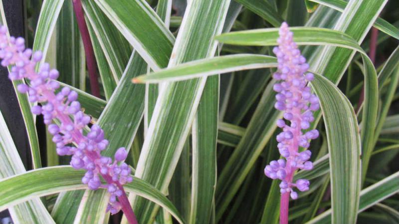●朝から激しい雨が降っています 秋雨前線の影響でしょうか 昨日撮った花壇の縁取りの「ヤブラン」の薄紫色の可愛い花がブドウの房のように付いています 山野の樹木の下草として自生していたが庭園の日当たりのよくない所にうえられていることが多いそうです やぶに生え葉の形がランににているところから「ヤブラン」という名前がついたと言われています 秋には丸い黒く光る実がなりその後皮が落ちで種子がむきだしになるという変わった性質をもっているようです