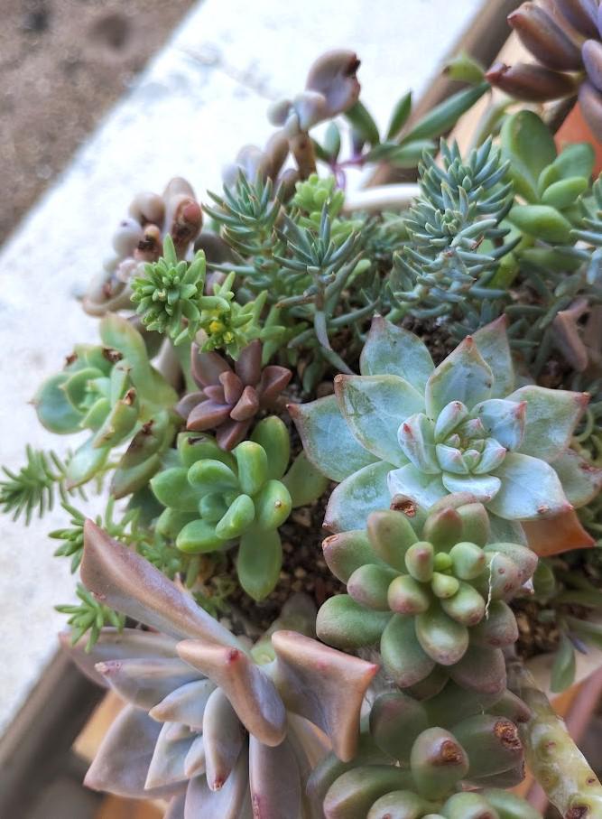 寄せ植えのメインを飾っていた小っちゃいブルーバードの茎がしぼみ、ベビーサンローズが伸び伸びし過ぎてきたので、【ガーデン多肉ゆう】さんでメンテナンスをしてもらいました。ブルーバードは、黒く死んでしまったところを切り取ったら、かろうじて頭(ロゼット)だけ残ったので、このまま発根を待つことに…ベビーサンローズは、伸びた部分をカットして他の鉢に植えるように持ち帰り。ドルフィンも成長著しかったので、カットして挿し足してもらいました。公民館に戻ってから、悩みつつもミチミチの寄せ植えに無理無理挿し足してみました!