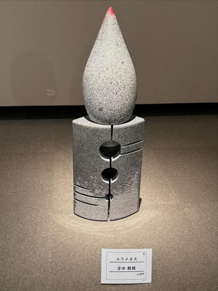石の浄朝 県美展出品作品 入選タイトル「ユラメカス」作者吉田朝頼ゆらめくローソクをイメージした石灯りをつくりました。石なのでゆらめきませんが「ユラメカス」ことができればなとの思いでという作品になっております。3人分の作品を展示期間中にご紹介します!と断言しましたので急いで投稿してます!残り1作品を明日、投稿させていただきます!!