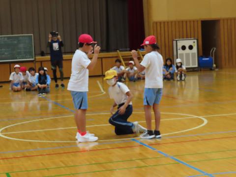 5年生の体育で、居住地交流学習がありました。体育では表現運動があり、体を使って「ある出来事」を班ごとに発表し合いました。火事を表現したグループ、上手でした。その後、中距離走大会に向けての練習ということで、5分間走で体を鍛えていました。一緒に学ぶことでいい体験をしていただいたと思います。
