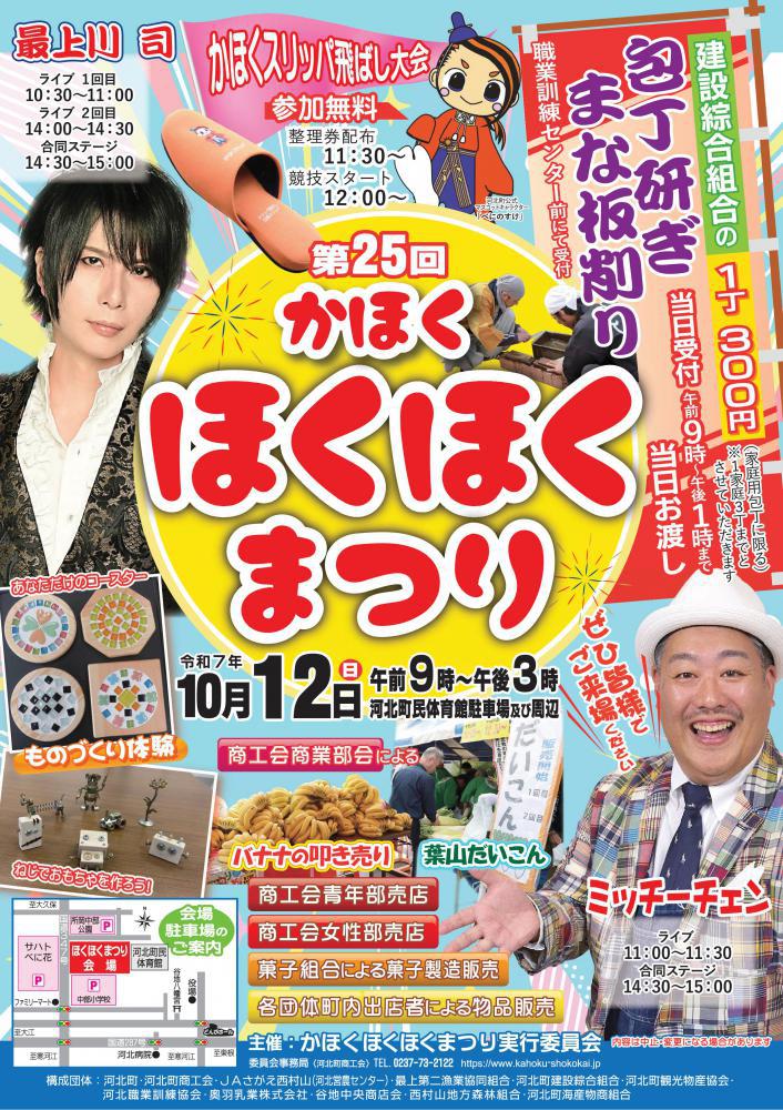 【必見】第25回かほくほくほくまつり完全ガイド!最上川司&ミッチーチェンLIVE、スリッパ飛ばしなど体験満載!山形県村山地域の中でも特に個性的なイベントとして知られる「かほくほくほくまつり」が今年も開催されます!最上川司さん、ミッチーチェンさんの豪華ステージをはじめ、河北町名物の「スリッパ飛ばし大会」、プロの技が光るサービス、そして地元グルメが大集合する、見て、食べて、体験して楽しい一日を徹底解説します! イベント概要:日時・場所・アクセス 開催日時: 令和7年10月12日(日)午前9時〜午後3時 開会式: 9:00スタート 場所: 河北町民体育館駐車場及び周辺 駐車場: 会場周辺に臨時駐車場あり(チラシをご確認ください) 【5選】絶対に見逃せない!ほくほくまつりの感動の目玉企画 1. 豪華ステージLIVE & 合同ステージ※最新スケジュールに更新しました! キッズダンスパフォーマンス: 開会式終了後すぐ! 最上川司 LIVE 1回目: 10:30〜11:00 ミッチーチェン LIVE: 11:00〜11:30 最上川司 LIVE 2回目: 14:00〜14:30 【必見】合同ステージ: 14:30〜15:00 2. 名物「かほくスリッパ飛ばし大会」河北町名物のスリッパを遠くまで飛ばす、熱気あふれる競技!整理券配布は11:30から、競技は12:00スタートです。参加無料! 3. プロの技!包丁研ぎ&まな板削り河北町建設総合組合による大人気サービス。家庭で切れ味が落ちた包丁や、使い込んだまな板をプロが修繕!当日受付は午前9時から(1丁300円)。 4. 絶品!商工会青年部&女性部のグルメ屋台商工業関係者による各種販売ブースが登場!バナナのたたき売りや、地元産品を使った葉山だいこん、菓子組合による菓子製造販売など、お腹も心も満たされること間違いなし! 5. 楽しいものづくり体験お子様も楽しめる「ものづくり体験」(コースター作り、ねじでおもちゃ作り)ブースも設置されます。旅の思い出になる作品を持ち帰りましょう。 中の人からの一口メモ(経験談)【最上川司さんのステージは必見!】 演歌歌手としての魅力はもちろんですが、実はロックバンドのボーカルもされているんです。その歌声のギャップが最高にカッコよく、一度聴いたらファンになること間違いなし!今回は合同ステージもあるので最後まで見逃せません!そして、河北町は知る人ぞ知るスリッパの町。スリッパ飛ばし大会は、想像以上に白熱して盛り上がりますよ!さらに、地元の建設組合さんによる包丁研ぎ・まな板削りは、家庭に絶対に必要なサービスです!プロの技で新品同様の切れ味・使い心地が復活します。この機会を逃さないで! イベント詳細情報・お問い合わせ先 主催・運営: かほくほくほくまつり実行委員会 お問い合わせ: 河北町商工会内(TEL: 0237-73-3122) 公式サイト: 河北町商工会 公式サイト よくある質問 (FAQ) スリッパ飛ばし大会の参加は無料ですか? はい、参加無料です。ただし、競技の整理券配布時間が11:30からとなっていますので、お早めに会場へお越しください。 包丁研ぎ・まな板削りの料金と受付時間を教えてください。 包丁研ぎ・まな板削りは1丁(1枚)300円です。当日受付は午前9時からとなります。大変人気のあるサービスのため、お早めの受付をおすすめします。 雨天の場合も開催されますか? 荒天時以外の開催情報については、公式サイトまたは主催者へ直接お問い合わせいただくことをおすすめします。屋外イベントも多いため、天候によっては内容が一部変更となる可能性があります。 /* ホバーエフェクト用CSSは削除された関連セクションにのみ適用のため、基本維持(今後の追加に備え) */? ? ? .related-card {? ? ? ? transition: transform 0.3s ease, box-shadow 0.3s ease;? ? ? }? ? ? .related-card:hover {? ? ? ? transform: translateY(-5px);? ? ? ? box-shadow: 0 8px 20px rgba(0,0,0,0.15) !important;? ? ? }? ? ? /* 中の人おすすめポイント用 */? ? ? .recommend-box {? ? ? ? border: 3px solid #ffcc66; /* テーマカラー:オレンジ系 */? ? ? ? background-color: #fff9e6;? ? ? ? padding: 15px;? ? ? ? margin: 20px 0;? ? ? ? border-radius: 10px;? ? ? }? ? ? .recommend-title {? ? ? ? color: #e67e22; /* アイコンカラーも統一 */? ? ? ? font-size: 1.2em;? ? ? ? margin-bottom: 10px;? ? ? ? border-bottom: 2px solid #ffcc66;? ? ? ? padding-bottom: 5px;? ? ? } ? ? {? ? ? "@context": "https://schema.org",? ? ? "@graph": [? ? ? ? {? ? ? ? ? "@type": "Event",? ? ? ? ? "name": "第25回 かほくほくほくまつり",? ? ? ? ? "startDate": "2025-10-12T09:00",? ? ? ? ? "endDate": "2025-10-12T15:00",? ? ? ? ? "eventStatus": "https://schema.org/EventScheduled",? ? ? ? ? "eventAttendanceMode": "https://schema.org/OfflineEventAttendanceMode",? ? ? ? ? "location": {? ? ? ? ? ? "@type": "Place",? ? ? ? ? ? "name": "河北町民体育館駐車場及び周辺",? ? ? ? ? ? "address": {? ? ? ? ? ? ? "@type": "PostalAddress",? ? ? ? ? ? ? "addressRegion": "山形県",? ? ? ? ? ? ? "addressLocality": "西村山郡河北町",? ? ? ? ? ? ? "streetAddress": "河北町民体育館周辺"? ? ? ? ? ? }? ? ? ? ? },? ? ? ? ? "image": [? ? ? ? ? ? "25回ほくほく_チラシ.jpg"? ? ? ? ? ],? ? ? ? ? "description": "最上川司、ミッチーチェンによるLIVEステージ、名物スリッパ飛ばし大会、プロの包丁研ぎ・まな板削りなど、お得で楽しい体験が満載の河北町の一大イベント。"