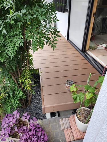 みなさん こんにちはリフォーム部の遠藤です前回踏み石を撤去して防草シートを施工したところにウッドデッキを施工しました土部を一部残し、足元にお客様がお花を植えるスペースも確保しました!< 施工中 >< 完成! >次回は、内部の完成形をアップします!